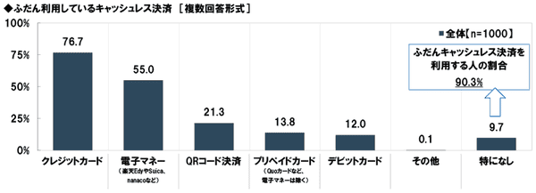 さらに、キャッシュレス決済において、実際に利用しているサービスを具体的に聞いた。1位はやはり「クレジットカード」76.7%が圧倒的に強く、以下「電子マネー(楽天EdyやSuica、nanacoなど)」55.0%が続き、やや離れた3位に「QRコード決済」21.3%がランクインした。「特になし」は9.7%で、残るビジネスパーソンの90.3%は、なんらかのキャッシュレス決済をふだんから利用していることがわかる。