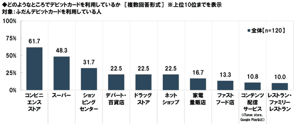 なおデビットカードについて、「どのようなところでデビットカードを利用しているか」を、利用者120名に聞いたところ、1位「コンビニエンスストア」61.7%、2位「スーパー」48.3%、3位「ショッピングセンター」31.7%、4位「デパート・百貨店」「ドラッグストア」「ネットショップ」(いずれも22.5%)となった。高額品に限らず、日常的に活用している人も多いようだ。