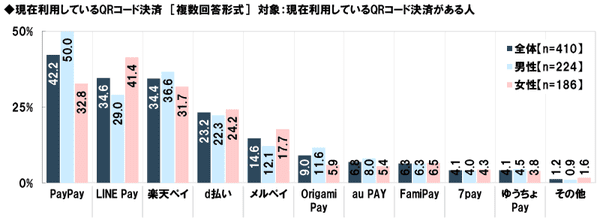 ただし、「知っているQRコード決済」を男女別で見ると、男性1位は「PayPay」61.0%だが、女性1位は「LINE Pay」73.0%となっている。また「今後も利用したいと思うQRコード決済」では、「PayPay」91.9%がもっとも高い一方で、「LINE Pay」83.8%、「Origami Pay」83.8%、「d払い」82.1%、「楽天ペイ」81.6%、「FamiPay」80.8%が団子状態の横並びになっており、今後も併用するユーザーが多いと思われる。