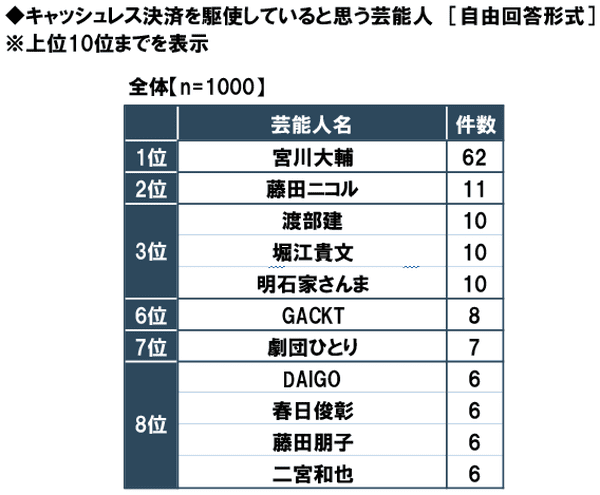 最後に、“キャッシュレス決済と芸能人”という切り口で、「キャッシュレス決済を駆使していると思う芸能人」(敬称略)を聞いたところ、1位はPayPayイメージキャラも務める「宮川大輔」62件、2位に「藤田ニコル」11件、3位に「渡部建」「堀江貴文」「明石家さんま」同数10件がランクインした。