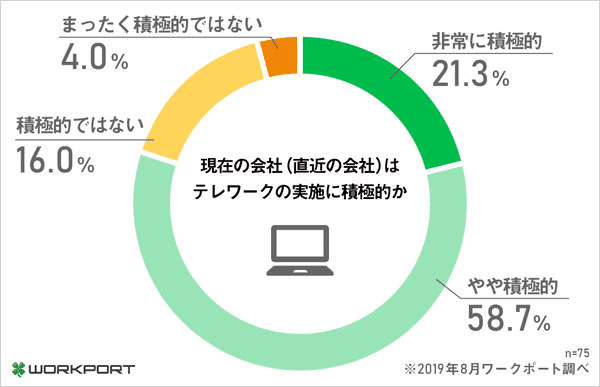 次に、「現在の会社(直近の会社)はテレワークの実施に積極的か」を聞くと、ポジティブ(非常に積極的、やや積極的の合計)は合わせて80.0%。一方でネガティブ(積極的ではない、まったく積極的ではないの合計)も20.0%が存在した。