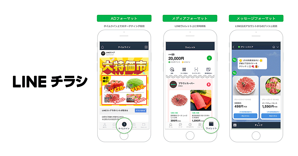 LINEチラシは「AD」「メディア」「メッセージ」の3種のフォーマットがある。ADフォーマットは市町村レベルでのエリアターゲティング配信が可能で、近況を友だちに伝える「LINEタイムライン」のユーザーを対象にする。メディアフォーマットは、ユーザーの属性や利用状況に応じ、それぞれに最適化した商品情報を配信する。