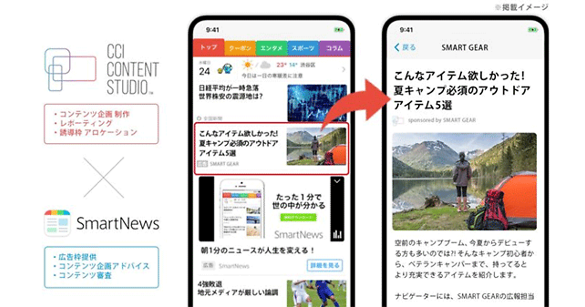 インターネット広告事業のサイバー・コミュニケーションズ(CCI)は、ニュースアプリ運営のスマートニュースが展開する同アプリ「SmartNews」に特化したコンテンツマーケティング広告「SmartNews Branded Content Ads」を始めた、と9月12日発表した。企画立案、制作から最適化運用、広告の評価分析まで一括して手掛ける。