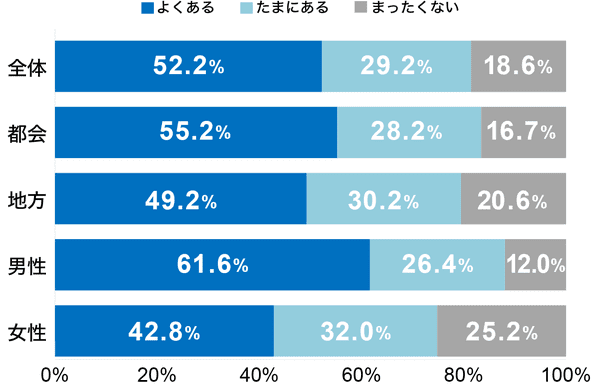 エリア別で見ても、「都会エリア」(東名阪周辺地域)で「よくある」と「たまにある」が合計83%、「地方エリア」(それ以外)で79%が利用している。サービスを取り入れている店舗の数などを考えれば、ほぼ遜色なく地方も普及していると考えられる。ただし男女別では、男性の「よくある」が62%なのに対して、女性は43%と、かなりの差が生じている。