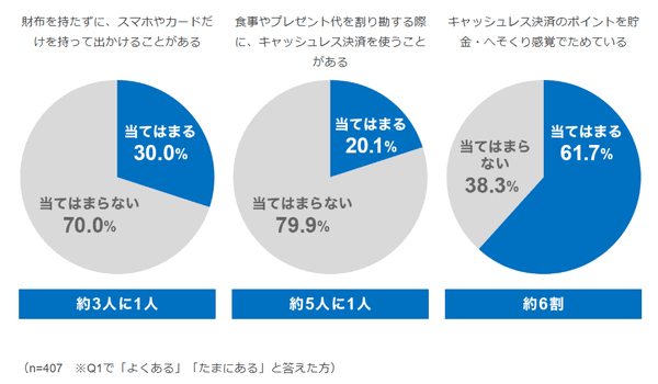 「キャッシュレス決済関連で、日常的な行動」について聞くと、「財布を持たずに、スマホやカードだけを持って出かけることがある」人が30%、「食事やプレゼント代を割り勘する際に、キャッシュレス決済を使うことがある」人が20%、「キャッシュレス決済のポイントを貯金・へそくり感覚でためている」人が62%存在することが明らかとなった。割り勘のシーンで、思った以上に使われている印象だ。