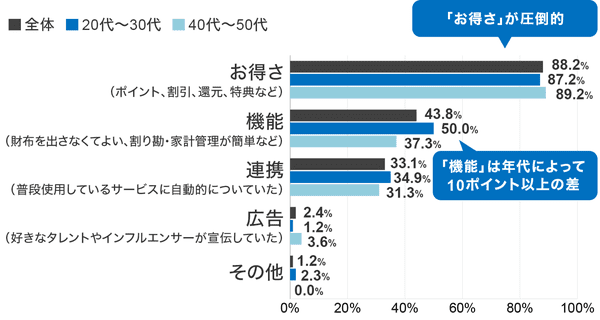 さらにスマホ決済サービスのなかで、いわゆる“○○Pay”のような「コード決済型サービス」について、ダウンロード・登録など、利用の有無を聞くと、34%が利用していると回答した。そのきっかけについては、「お得さ(ポイント、割引、還元、特典など)」が圧倒的に多く88%。ただし20代~30代の若者世代では、現金を扱わなくて良いといった機能面を挙げる人は50%と40代~50代より多かった。