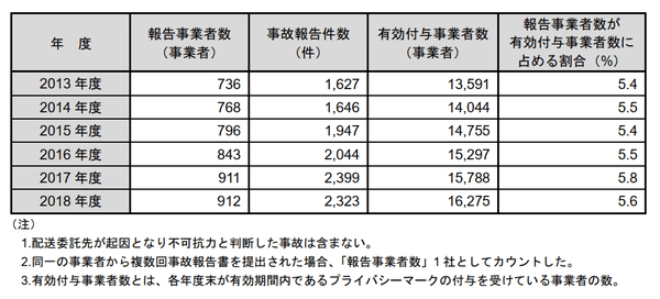 2018年度時点において、プライバシーマークが付与されている事業者は16,275事業者。そのうち912事業者から、2,323件の個人情報の取扱いにおける事故が報告された。全事業者の増加にともない、報告事業者数も増加しているが、比率で見ると大きな変化はなく、ほぼ5.5%前後を推移している。