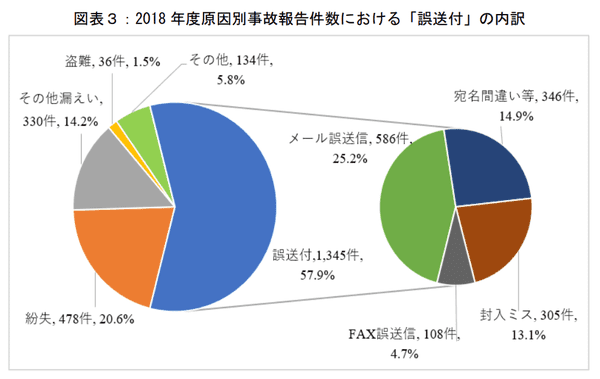 「誤送付」の内訳をさらに詳しく見ると、「メール誤送信」586件(25.2%)がもっとも多く、「宛名間違い等」346件(14.9%)がそれに続いている。