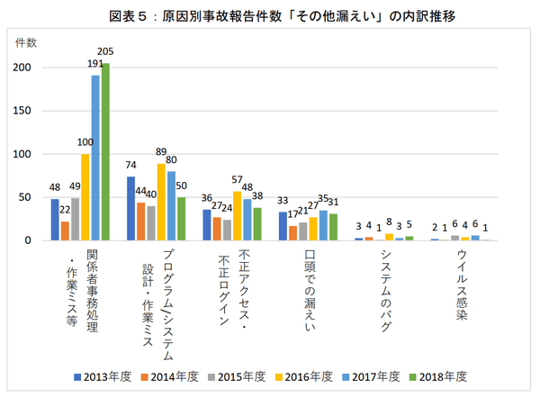 「その他漏えい」の内訳をさらに詳しく見ると、「関係者事務処理・作業ミス等」205件(62.1%)がもっとも多く、「プログラム/システム設計・作業ミス」50件(15.2%)が続く。「不正アクセス・不正ログイン」は38件(11.5%)だった。「関係者事務処理・作業ミス等」が増加傾向にあり、この1、2年で倍以上になっている。