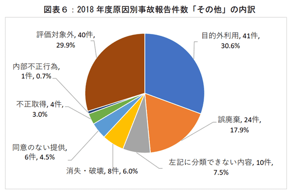 「その他」の内訳をさらに詳しく見ると、「目的外利用」41件(30.6%)、「誤廃棄」24件(17.9%)でほぼ半数を占める一方、「評価対象外」(本人が自身の個人情報を紛失した場合、事故対象に個人情報が含まれていなかった場合等)も40件と多い。前年からは「目的外利用」が急増しているという(2017年度18件、2018年度41件)。