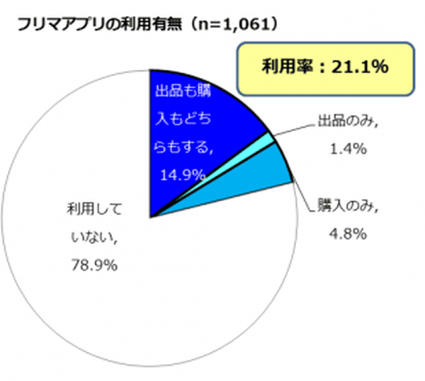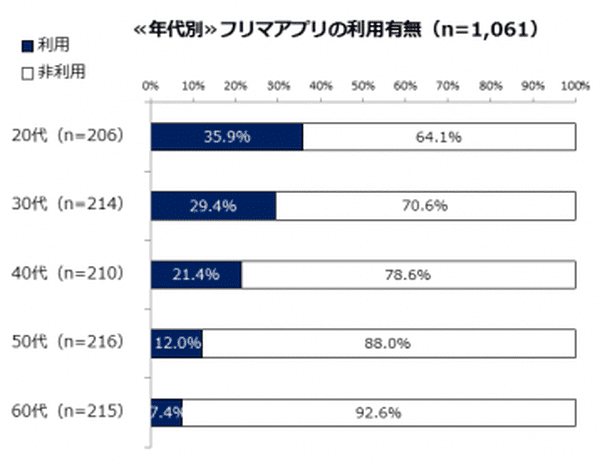 フリマアプリの利用率は、前述のとおり21.1%だが、そのうちの70.5%(全体の14.9%相当)が「出品も購入もどちらもする」と回答した。「出品のみ」は6.7%(全体の1.4%相当)だった。年代別では、20代の利用率がもっとも高く、世代が高くなるにつれ利用率が下がるが、1年前より30代・40代・60代の利用率が伸びているという。