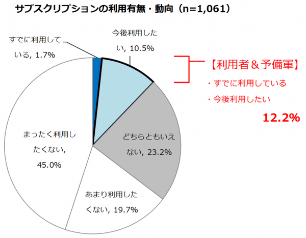 実際全体での利用有無・利用意向は「すでに利用している」1.7%、「今後利用したい」10.5%、「どちらともいえない」23.2%、「あまり利用したくない」19.7%、「まったく利用したくない」45.0%と、利用に否定的な人が多かった。その理由については、割高感をあげる人が多かったとのこと。