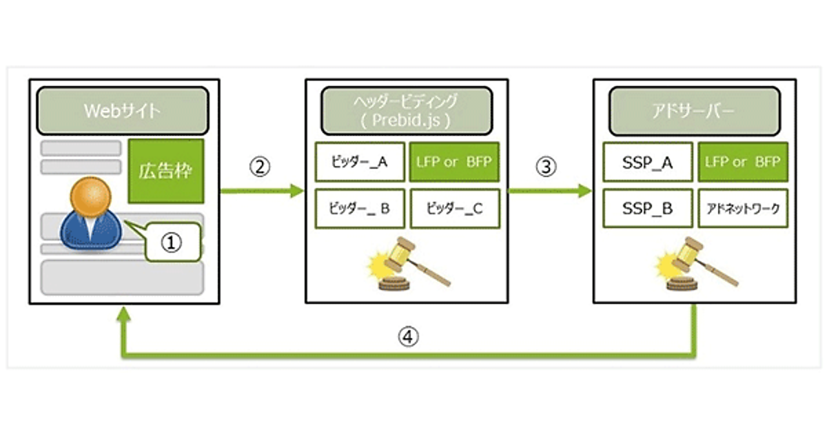①Prebid.jsに対応しているWebサイトにユーザーが訪れ、広告リクエストが発生する。