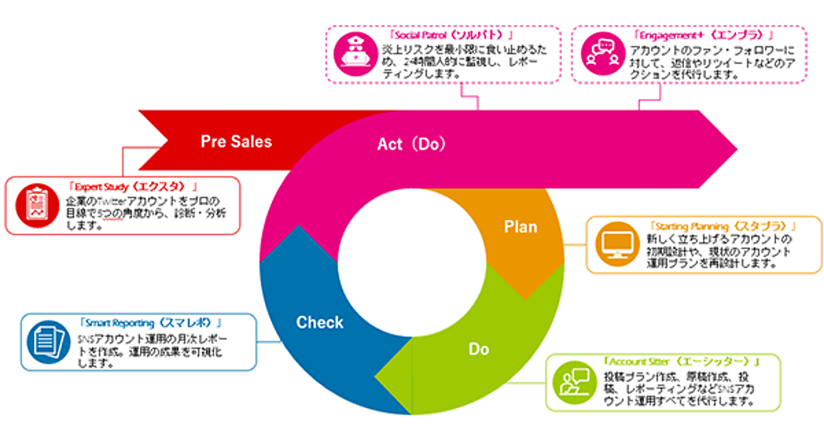 「Twitter」アカウントを診断・分析する「Expert Study(エクスタ)」▽アカウントの初期設計や現状の運用プランを再設計する「Starting Planning(スタプラ)」▽SNSのアカウント運用全てを代行する「Account Sitter(エーシッター)」▽成果を可視化する「Smart Reporting(スマレポ)」--などのサービスを用意した。