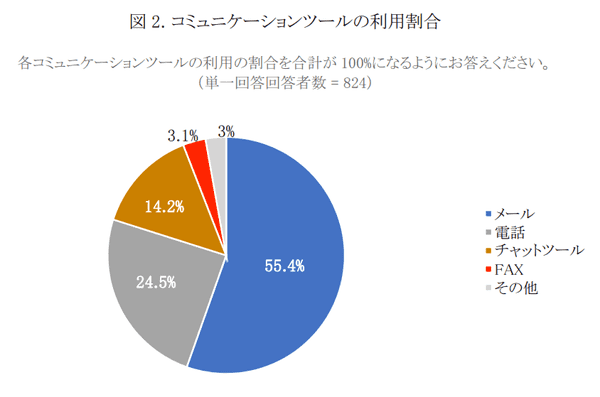 まず「導入しているチャットツールの使用期間」を聞くと、「半年未満」18.0%、「半年以上1年未満」11.2%、「1年以上3年未満」33.0%、「3年以上前」37.9%で、浸透具合が伺える。一方、メール・チャットツール・電話等のコミュニケーションツール全般について利用割合を聞くと、「メール」55.4%、「電話」24.5%、「チャットツール」14.2%と数値は低い。ただし、ビジネスチャットツールは、「非登録者≒社外の人間は、即座にコミュニケーションに参加できない」という性格の違いがあるため、使い分けによる側面があると考えられる。