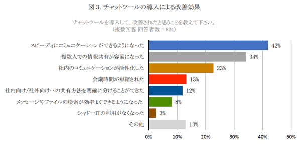 そこで「チャットツールの導入による改善効果」を具体的に聞くと、「スピーディにコミュニケーションができるようになった」41.9%と、「複数人での情報共有が簡単になった」34.1%、「社内のコミュニケーションが活性化した」22.7%の声が上がっている。