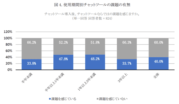 では、チャットツールならではの課題は存在しないのか? 「課題を感じている」としたのは40.0%。ただし導入年数により上下している。