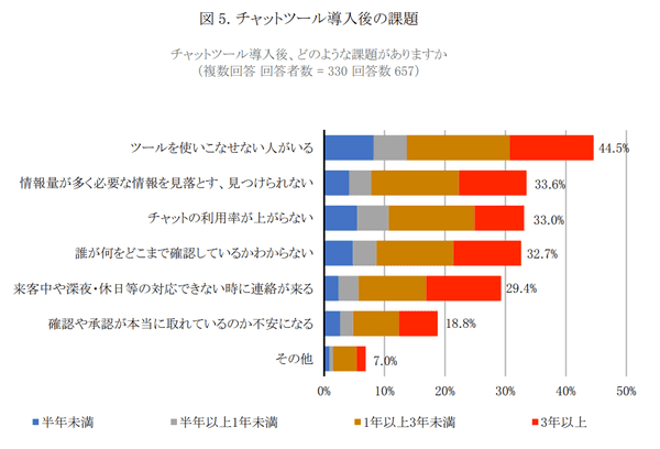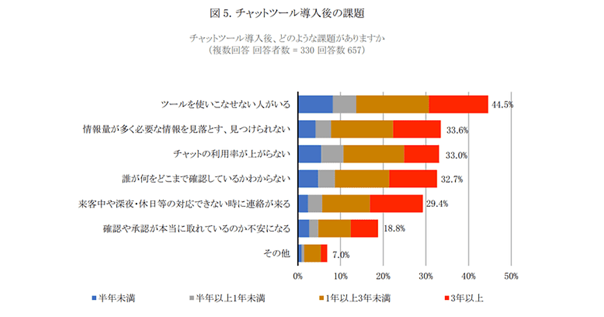 具体的に「課題として感じたこと」を聞くと、「ツールを使いこなせない人がいる」44.5%がとくに多く1位。「情報量が多く必要な情報を見落とす、見つけられない」33.6%、「チャットの利用率が上がらない」33.0%がランキング上位となった。