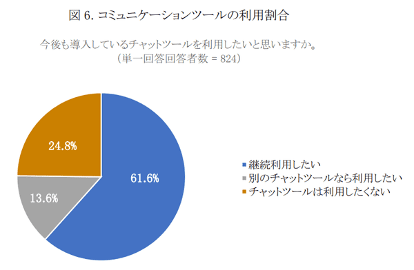 今後の利用意向については、「継続利用したい」61.6%、「現在使っているツールと別のチャットツールなら利用したい」13.6%、「チャットツールは利用したくない」24.8%と、利用意向は高いが課題も見え隠れする結果となっている。