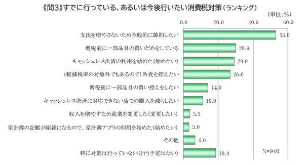 消費税増税対策の上位は「全般的な節約」「買いだめ」、3位に「キャッシュレス決済」
