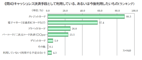 具体的に「キャッシュレス決済として利用している、今後利用したいもの」を聞くと、「クレジットカード」88.5%、「電子マネー(交通系ICカードなど)」57.4%、「プリペイドカード」26.0%、「バーコード/二次元コード」23.5%の順。