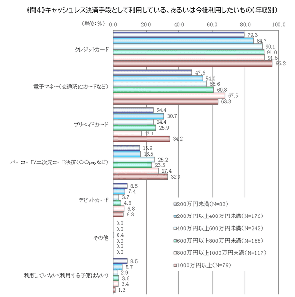 これを年収別に見ると、クレジットカード、電子マネー、バーコード/二次元コードは、ほぼ年収に比例して利用率が上がっていく。プリペイドカードは年収1000万円以上の層が突出、デビットカードは、年収に関係なく利用されていた。