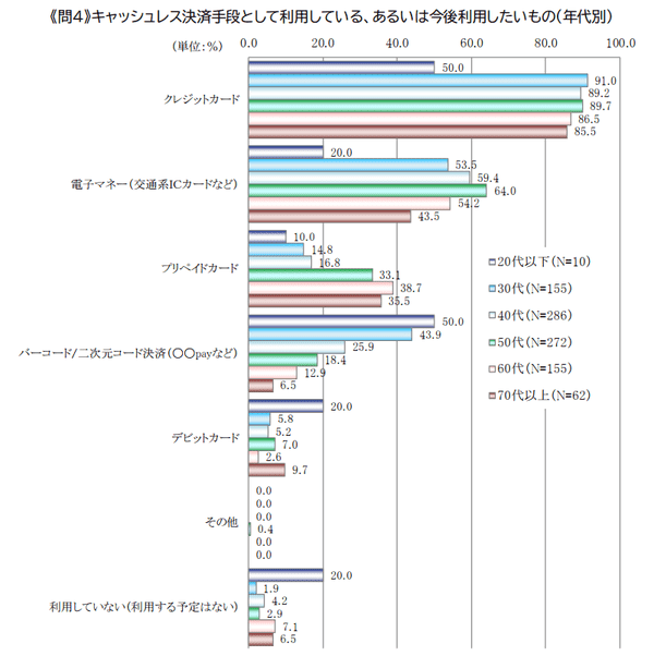年代別で見ると、バーコード/二次元コード、デビットカードは若い世代、とくに20代の関心が高い。一方で、20代は「利用していない(利用する予定はない)」も突出しており、二極化が見られる。