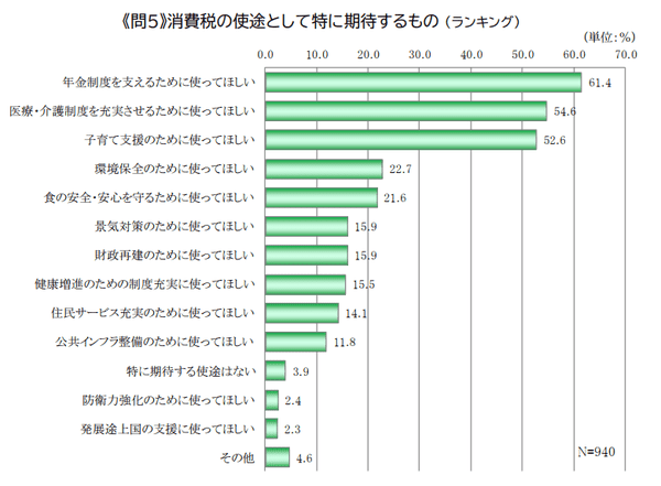 政策としての消費税増税に対する考えを探るべく、「消費税の使途として特に期待するもの」を聞くと、「年金制度」61.4%、「医療・介護制度」54.6%、「子育て支援」52.6%と、社会保障制度の充実がとくに期待されていた。
