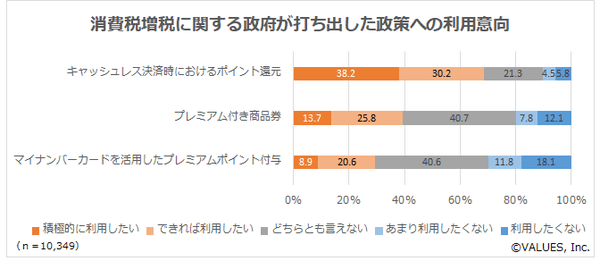 ヴァリューズは、政府が導入する消費増税対策の認知と利用意向について、調査した結果を発表した。2019年10月から始まる消費税増税では、主に食料品に適用される「軽減税率」のほか、「キャッシュレス決済を対象にしたポイント還元制度」「プレミアム付商品券制度」など政府による複数の対応策が実施される。同社では、アンケート調査、マーケティング分析サービス「VALUES eMark+」を使用したネット行動分析を、約1万人に対して行った。