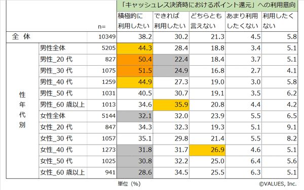 「キャッシュレス決済時におけるポイント還元」について、男女年代別で利用意向を見ると、男性20~30代は過半数が「積極的に利用したい」と、強い活用意向を示している。家計を握っているとされる女性層、とくに40代~60代以上の女性は、対照的に利用意向が低い。