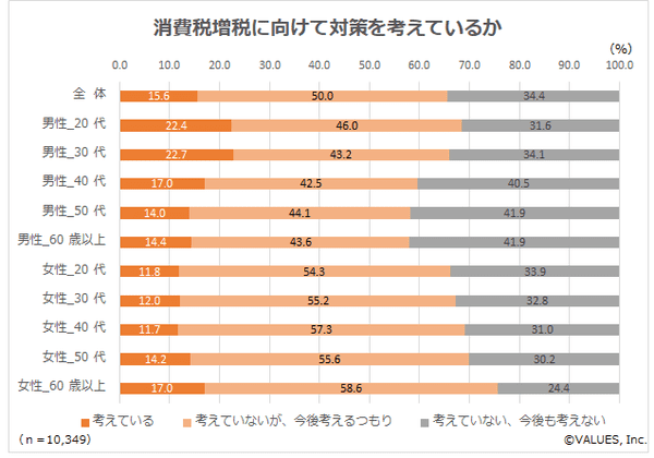 「消費税増税に向けて対策を考えているか」という設問でも、男女年代別で見ると、男性20~30代で「考えている」という回答が多かった一方で、女性はすべての年代で過半数が「考えていないが、今後考えるつもり」という姿勢だ。