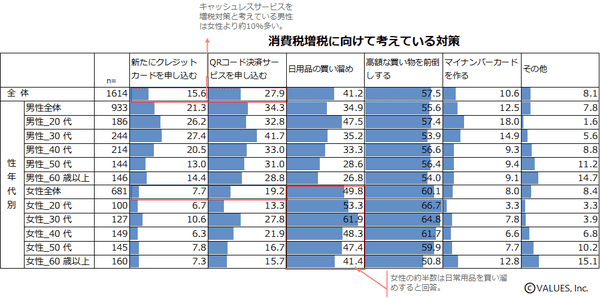 「消費税増税対策を考えている」と回答した1,614人に具体的な増税対策を聞くと、「高額な買い物を前倒し」という人が全般的に多かった。女性層では「日用品の買いだめ」も目立つ。逆に男性層は「新たにクレジットカードを申し込む」「QRコード決済サービスを申し込む」が若干全体より高い数字を示している。
