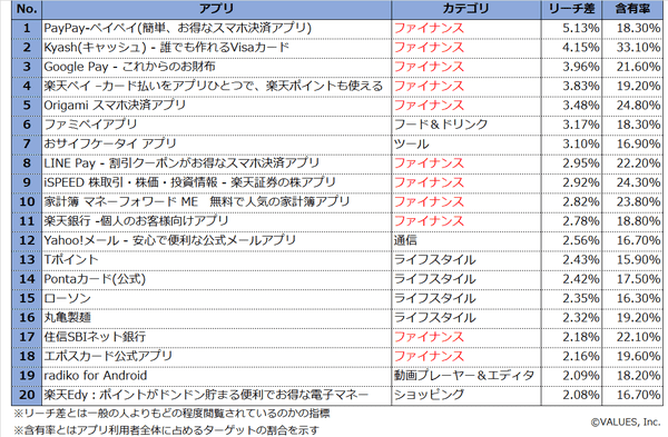 また“増税対策を考えている人が特徴的に利用しているアプリ”について、特徴値順でランキングを行った。一般の人より閲覧されている指標を「リーチ率」、アプリ利用者全体に占めるターゲットの割合を「含有率」として算出。その結果、リーチ差トップ5は「PayPay」5.13%、「Kyash」4.15%、「Google Pay」3.96%、「楽天Pay」3.83%、「Origami」3.48%と、キャッシュレス決済サービスが独占した。含有率では「Kyash」が33.10%と高い。