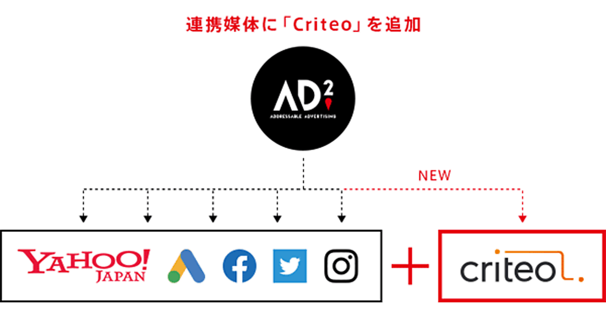 従来の「Facebook」「Instagram」「Yahoo!」「Google」「Twitter」に加え、AD2からCriteoのリターゲティング広告「Criteo」の月間19億人のユーザーにも広告の配信が可能になった。AD2で作成したセグメントリストを一括連携し、個人情報に触れることなく配信でき、企業の顧客データが複数の媒体で生かせる。