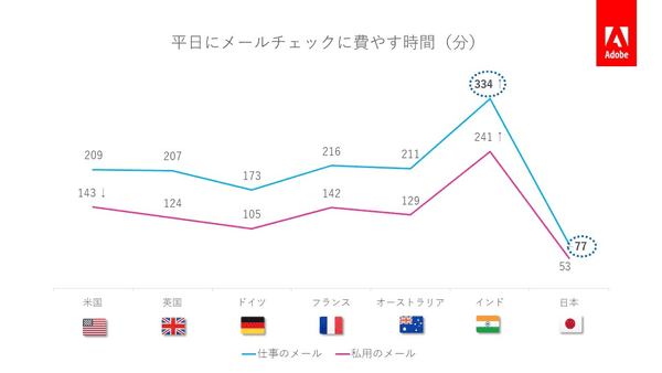 まず、「メールをチェックするのに、平日どのくらいの時間を費やすか」を聞いたところ、日本人は仕事関連メールで77分、私用メールで53分と、いずれも7か国で最短。最も長かったインドの仕事334分、私用241分と比較すると、ほぼ4分の1の短さだ。