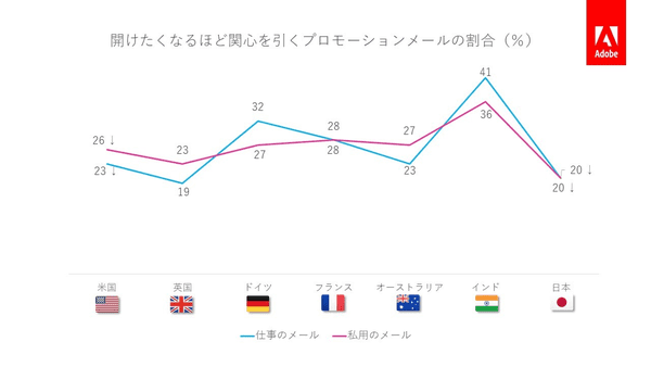 ここで、「思わず開きたくなるほど関心を引く、企業からのプロモーションメールはあるか」についても聞くと、日本は仕事関連でも私用でも20%と、やはり諸外国に比べて低かった。