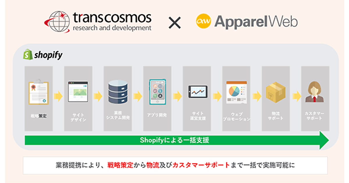 トランスコスモス技術研究所とアパレル・ファッション企業のWebマーケティング支援のアパレルウェブは、業務提携してECプラットフォームShopifyを利用したEC事業の包括的支援サービスを開始した、と10月14日発表した。