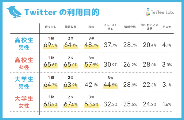 さらに「利用目的」について聞くと、高校生・大学生ともに1位は「暇つぶし」、僅差で2位に「情報収集」が続いた。3位の「趣味」は、“趣味の情報の収集”ではなく“ツイートすること自体が趣味”の意で、これも5割前後存在している。