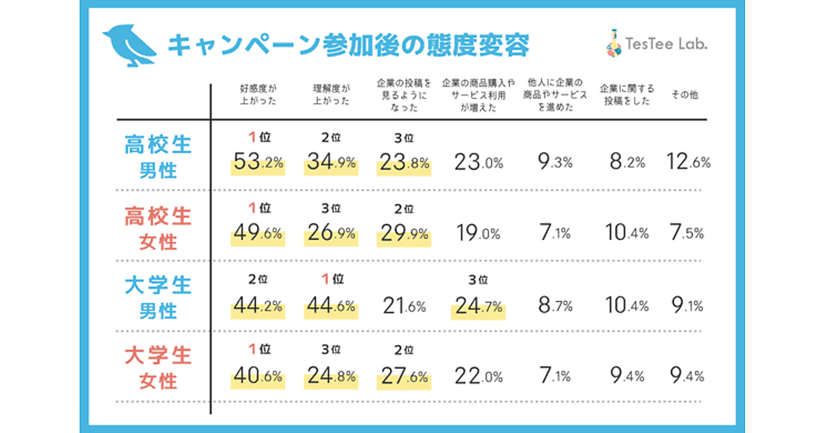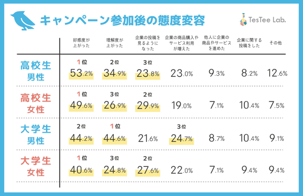 「キャンペーンを知ったきっかけ」については、高校生・大学生ともに、「リツイートなどで流れてきた」(高校生75.6%、大学生74.6%)がもっとも多く、それに「Twitter内で広告を見た」(高校生31.0%、大学生31.1%)が続いた。高校生・大学生で大きな差異はない模様。しかし「キャンペーンに参加した後の、行動やその企業に対する印象」について調査したところ、大学生よりも高校生のほうが、女子よりも男子のほうが「好感度が上がった」と回答した人の割合が大きかった。また「その企業の商品購入やサービス利用が増えた」がどの層でも2割前後存在しており、かなりの効果が見込めると言える。