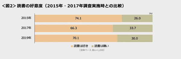 一方、読書が好きか嫌いかの「好意度」を聞くと、「読書は好き」は70.1%。2015年から2017年にかけては減少していたが、今回は若干数値を戻した。習慣化には至っていなくても、やはり“本”を愛する人が根強く存在している様子が伺える。