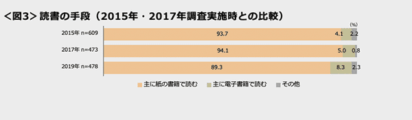 近年は電子書籍が定着してきたが、「読書の手段」については、2015年・2017年・そして今回の2019年の調査でも、圧倒的に「主に紙の書籍で読む」派が多く、9割前後を占めている。今回初めて89.3%と9割を下回ったが、まだまだ紙の書籍は人気だ。