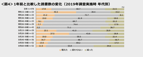 最後に「1年前と比べて読書数はどう変化したか」を聞くと、どの性別・年代でも「変わらない」が多数派だったが、男性15~19歳、女性20~29歳で「増えた」が明らかに高かった。