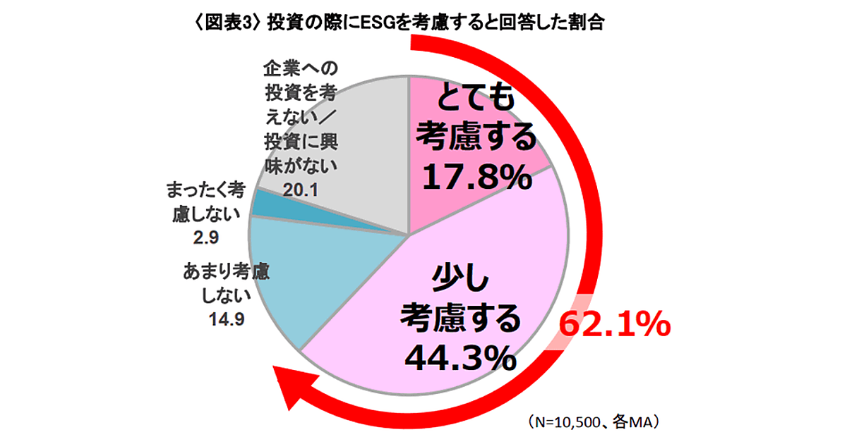 「ESGに対して積極的に取り組んでいる企業」であることは、投資対象として高評価されやすい。一般生活者にとっても関心は高く、「投資を考える際、企業のESGに対する取り組みをどの程度考慮するか」と聞くと、「とても考慮する」17.8%、「少し考慮する」44.3%と、6割以上ESGへの取り組みに注目していた。