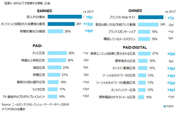 最後に、30代以下がどのような情報を信頼するかを、Earned(クチコミ)、Owned(自社メディア)、Paid(広告メディア)、Paid-Digital(デジタル広告メディア)という4つの情報ソースごとに見ると、全ソースのなかで、「知人からの勧め」(Earned)が1位。以下「オンラインに投稿された消費者の意見」(Earned)、「ブランドのWebサイト」(Owned)が続く。とくに「オンラインに投稿された消費者の意見」は、2017年から12ポイント増加し、デジタル世代のなかで大きな比重を占めるようになった。