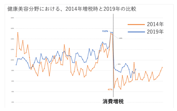 増税そのものの影響を見るため、2014年4月1日の増税(5%→8%)と比較してみた。具体的には、健康美容分野の売り上げで比較している。2014年の増税では、同年2月水準に対し、53%の落ち込みを記録していたが、2019年の増税は15%減に留まっており、前回増税に比べ、緩やかな反応と考えられる。