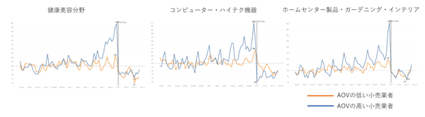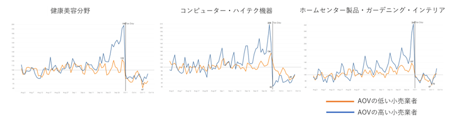 なお「増税前の駆け込み購入」に焦点を当てると、健康美容、コンピュータ・ハイテク機器、ホームセンター製品・ガーデニング・インテリアなどの複数のカテゴリにおいて、AOV(平均注文価格)の高い小売業者のほうが、増税前の売上が伸びていたという。一部カテゴリーでは高額商品ほど増税前に購入されていた模様だ。