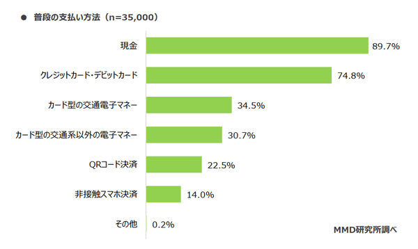 まず全員に「普段の支払い方法」(複数回答可)を聞くと、「現金」89.7%が最多。2位には「クレジットカード・デビットカード」74.8%、やや数字を落として「カード型の交通電子マネー」34.5%が続いた。「QRコード決済」22.5%は5位、「非接触スマホ決済」14.0%は6位だった。