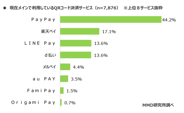 「QRコード決済を利用している」と回答した7,876人に、「現在メインで利用しているQRコード決済サービス」を聞くと、「PayPay」44.2%がトップ。以下「楽天ペイ」17.1%、「LINE Pay」「d払い」13.6%が続く。