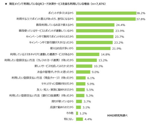 また「QRコード決済サービスを最も利用している理由」を聞くと、「ポイントが多くたまるから」38.2%、「利用することでポイント還元があったり、割引になるから」37.8%がとくに高く、利便性や利用店舗の多さ、キャンペーンを抑えてトップとなっている。