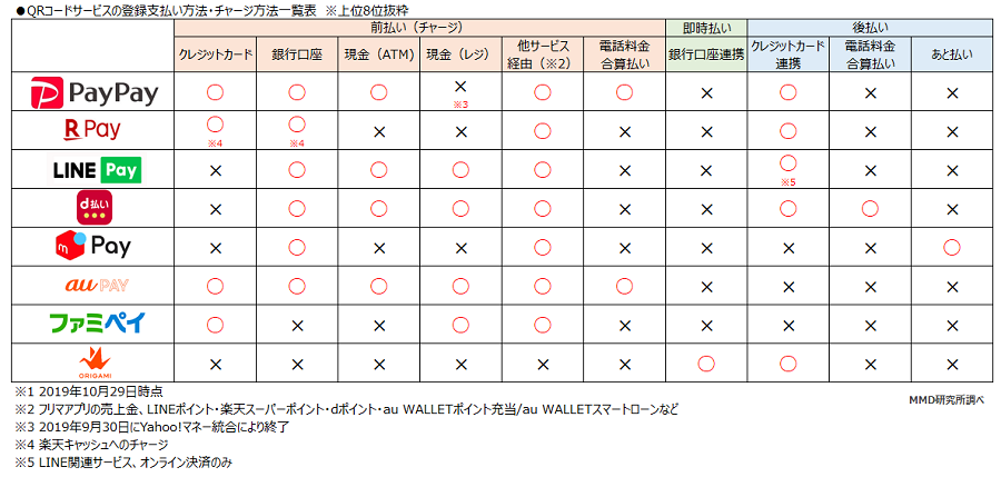 続いてMMD研究所では、「各QRコード決済サービスのチャージ方法」について整理。現在メインで利用しているサービスについて、クレカ、銀行口座、ATMなど、「前払い(チャージ)」「即時払い」「後払い」のチャージ方法ごとに利用度合いを聞いた。
